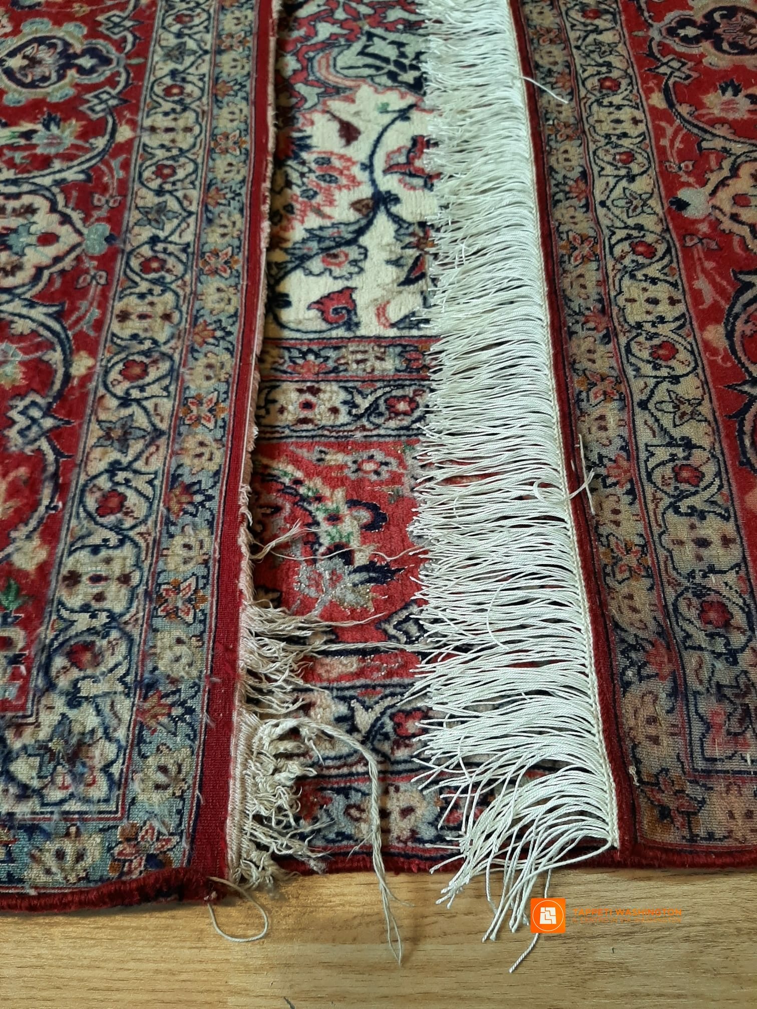 Il rifacimento completo delle frange per questo bellissimo tappeto persiano Isfahan misto seta. Categoria: Riparazione e restauroPost precedente:Inserimento frange su tappeto sardo Post successivo:Ricostruzione tappeto Shirvan antico